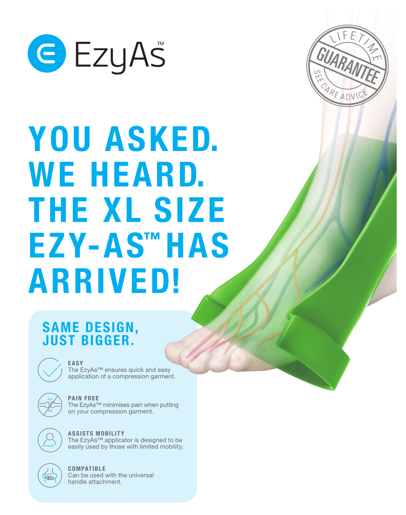 The EzyAs™ has been designed to assist those with limited mobility and lower body aches and pains. It also assists carers of patients who find it difficult to dress patients in tight-fitting compression garments. In the health care industry, the EzyAs™ is a medical sock aid that helps put on compression bandages or socks without bending, stretching on straining or removing socks, stockings or compression bandages easily.